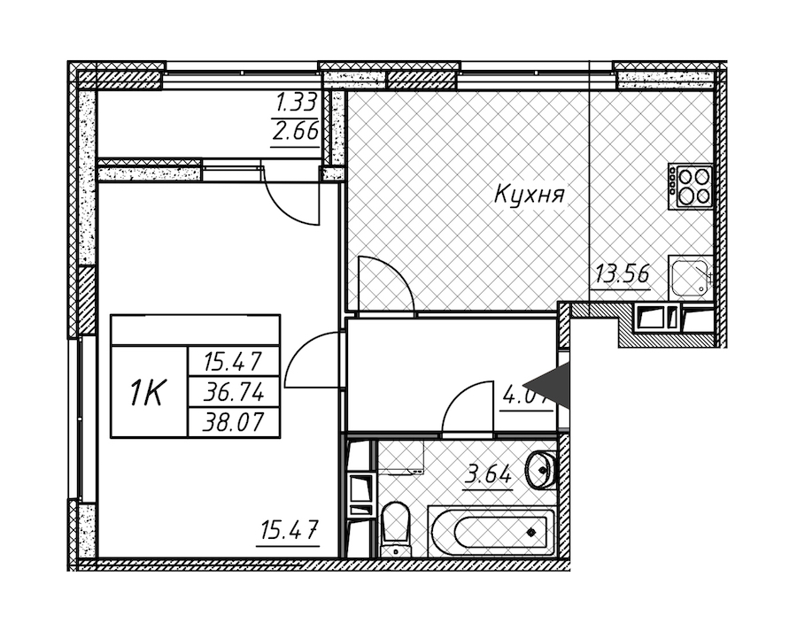 Однокомнатная квартира на 9-ом этаже 38,07 кв.м
