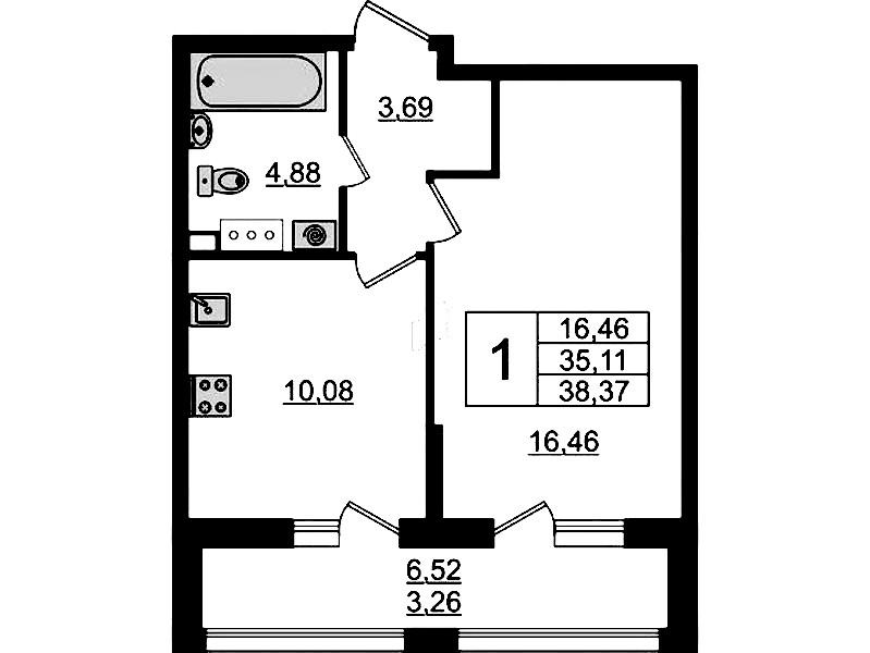 Однокомнатная квартира на 5-ом этаже 38,37 кв.м