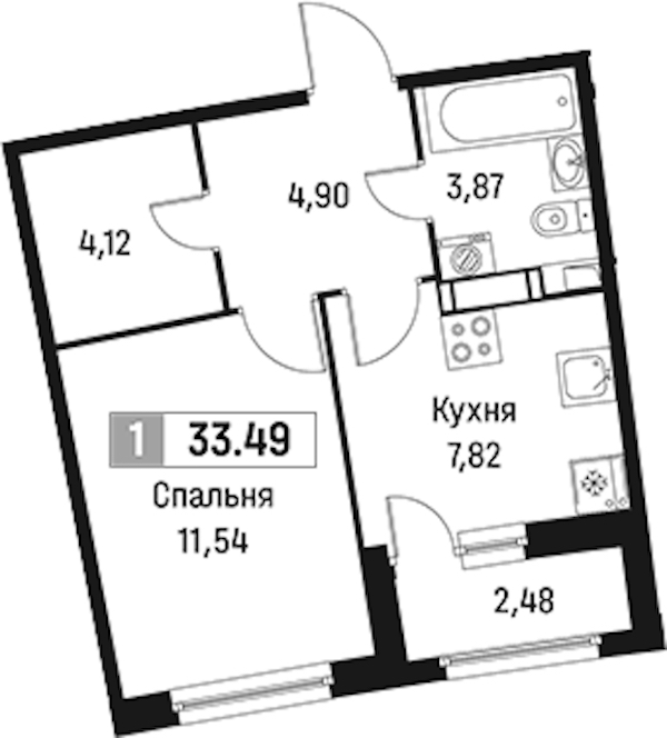 Однокомнатная квартира на 17-ом этаже 33,49 кв.м