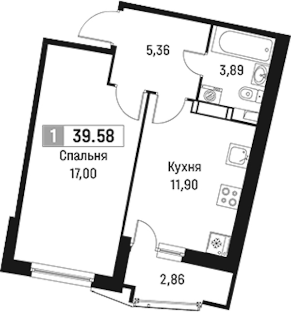 Однокомнатная квартира на 7-ом этаже 39,58 кв.м