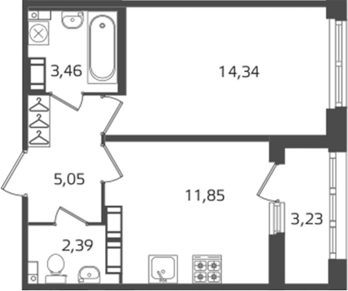 Однокомнатная квартира на 15-ом этаже 37,09 кв.м