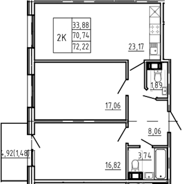 Двухкомнатная квартира на 2-ом этаже 72,22 кв.м