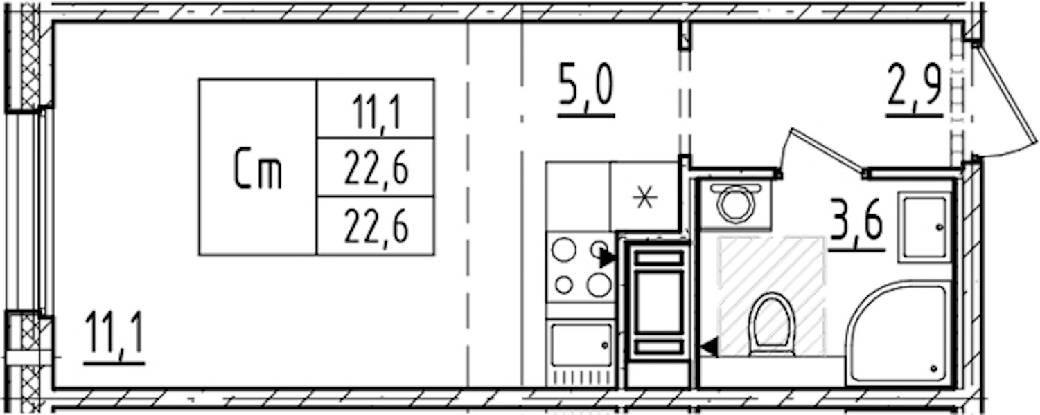Квартира-студия на 9-ом этаже 22,6 кв.м