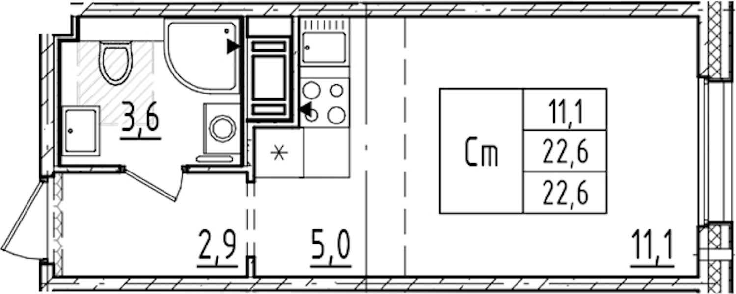 Квартира-студия на 10-ом этаже 22,6 кв.м