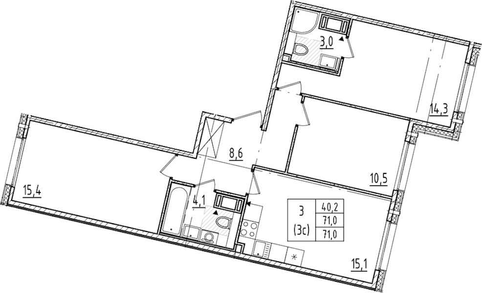 Трёхкомнатная квартира на 9-ом этаже 71 кв.м