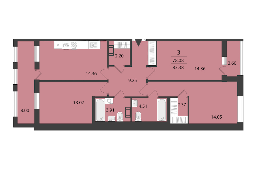 Трёхкомнатная квартира на 10-ом этаже 83,38 кв.м
