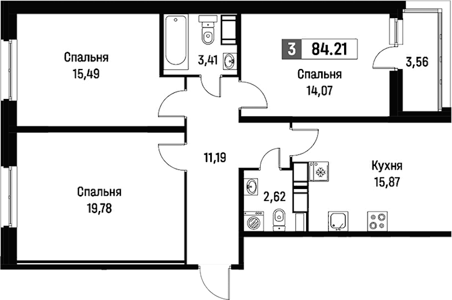 Трёхкомнатная квартира на 3-ем этаже 84,21 кв.м