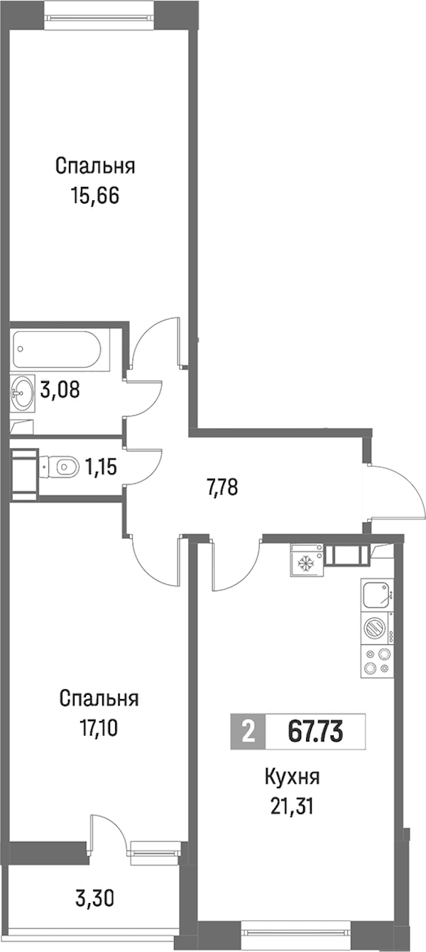 Двухкомнатная квартира на 10-ом этаже 67,73 кв.м