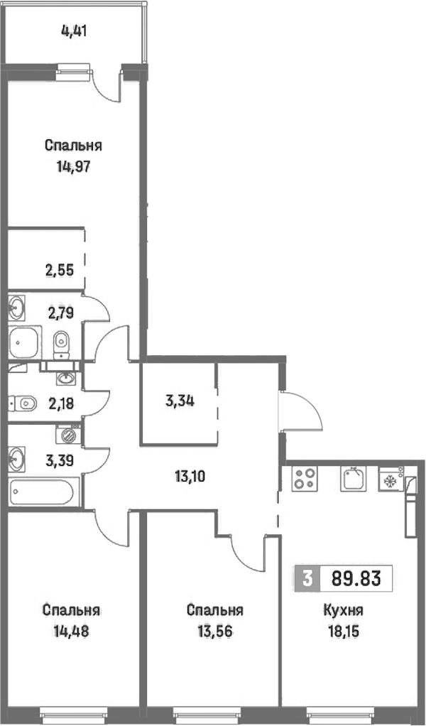 Трёхкомнатная квартира на 3-ем этаже 89,83 кв.м