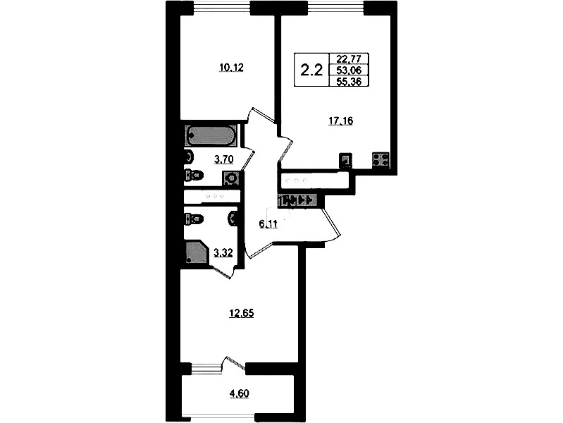 Двухкомнатная квартира на 15-ом этаже 53,06 кв.м