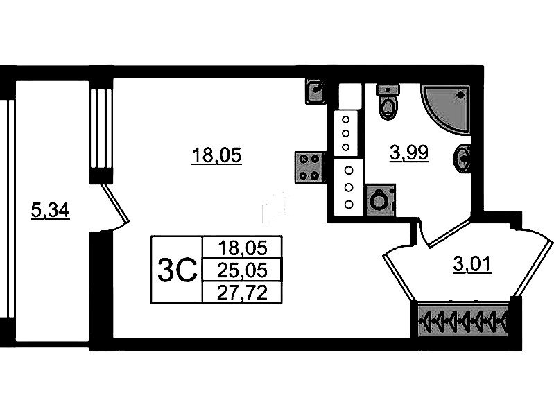 Квартира-студия на 21-ом этаже 25,05 кв.м