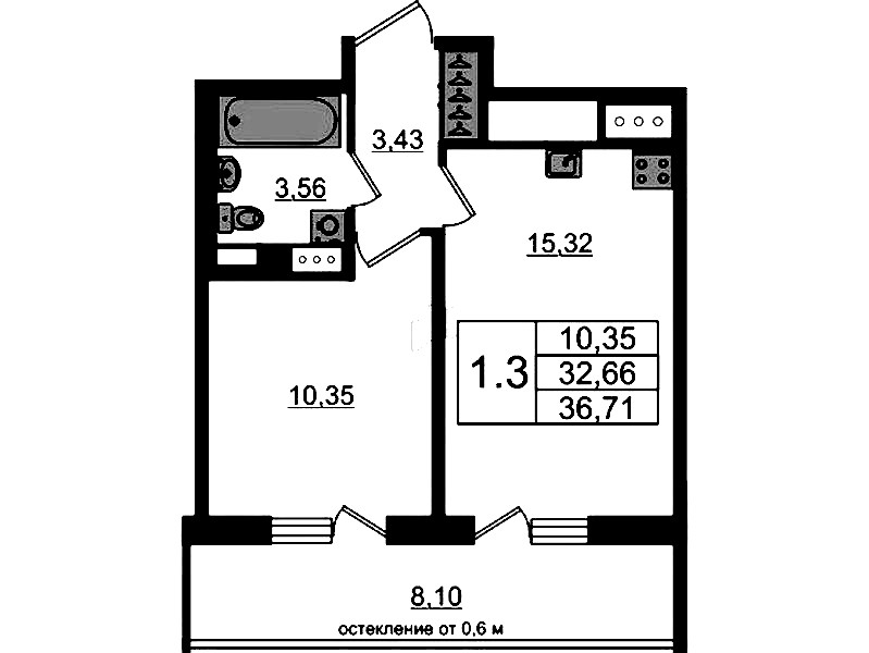Однокомнатная квартира на 10-ом этаже 32,66 кв.м