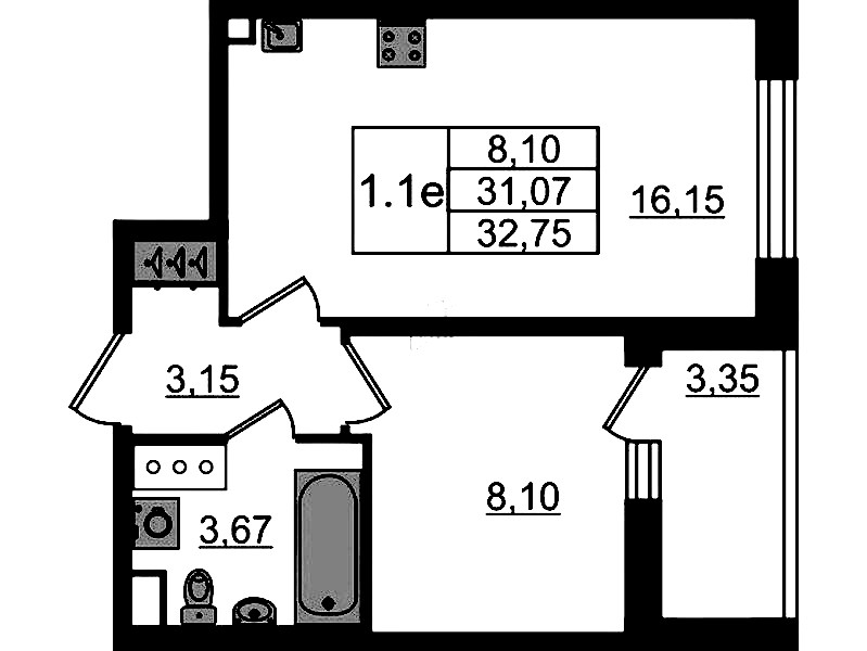 Однокомнатная квартира на 12-ом этаже 31,07 кв.м