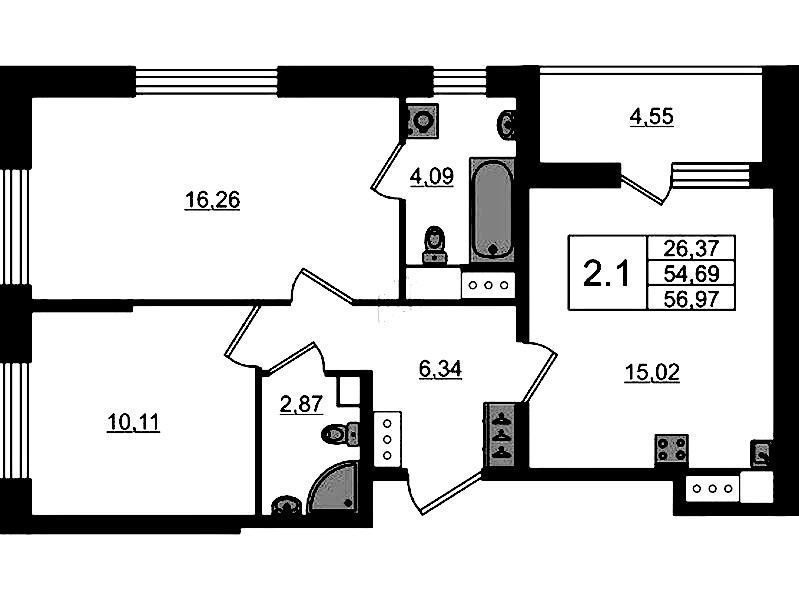 Двухкомнатная квартира на 6-ом этаже 54,69 кв.м