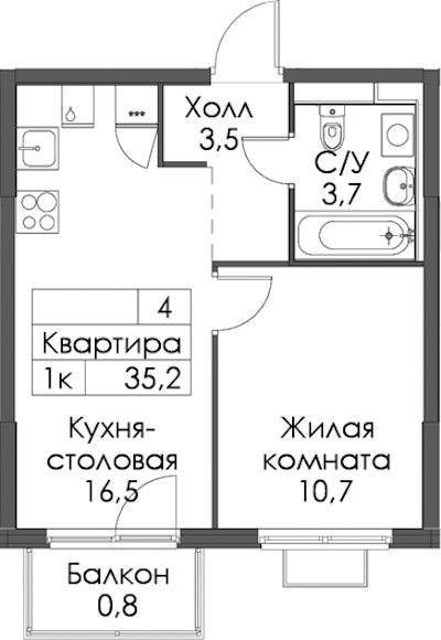 Однокомнатная квартира на 11-ом этаже 35,2 кв.м