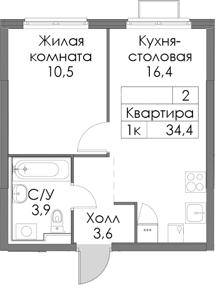 Однокомнатная квартира на 15-ом этаже 34,4 кв.м