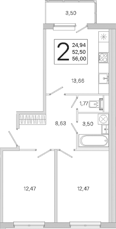 Двухкомнатная квартира на 2-ом этаже 52,5 кв.м