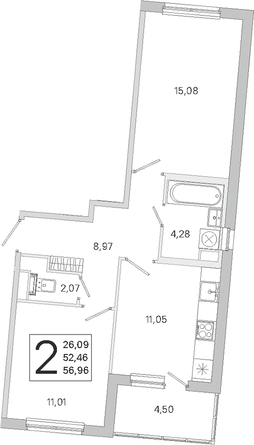 Двухкомнатная квартира на 2-ом этаже 52,46 кв.м