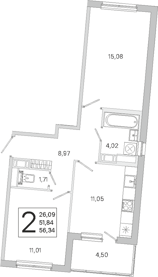 Двухкомнатная квартира на 5-ом этаже 51,84 кв.м
