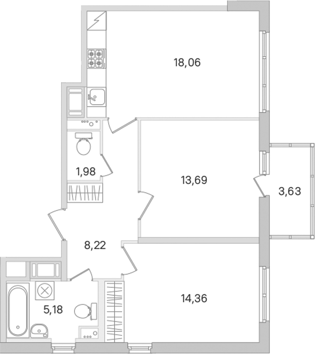 Двухкомнатная квартира на 7-ом этаже 61,49 кв.м