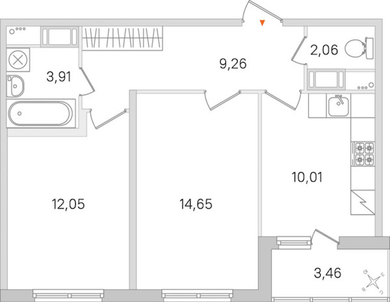 Двухкомнатная квартира на 3-ем этаже 51,94 кв.м