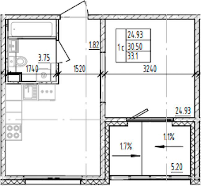 Квартира-студия на 9-ом этаже 33,1 кв.м