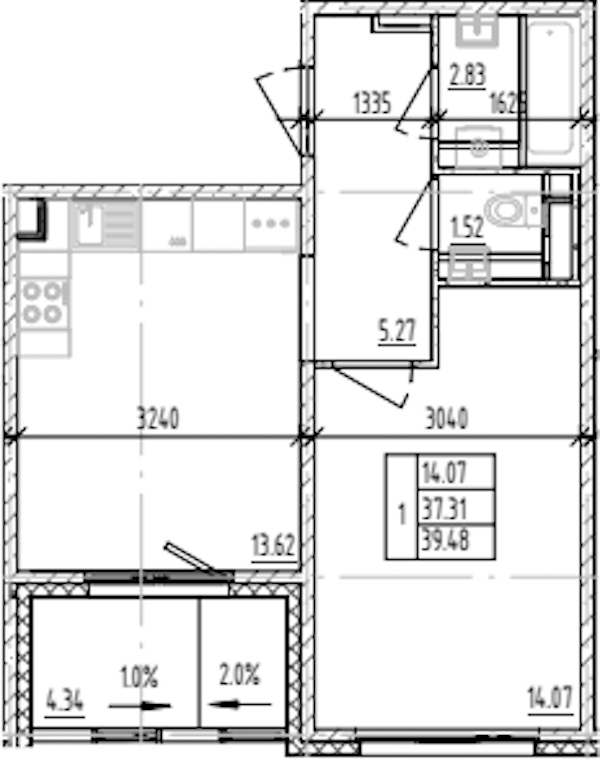 Однокомнатная квартира на 8-ом этаже 39,48 кв.м
