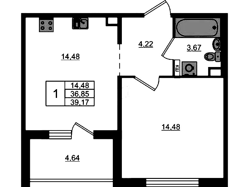 Однокомнатная квартира на 12-ом этаже 39,17 кв.м