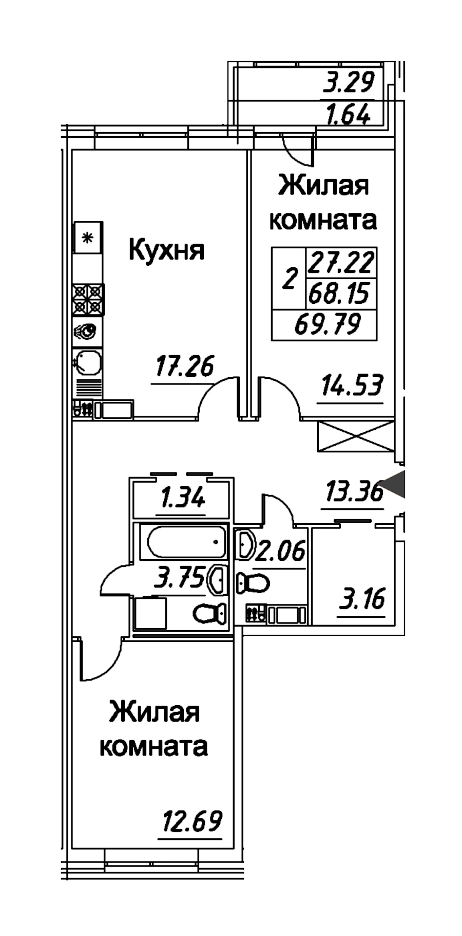 Двухкомнатная квартира на 4-ом этаже 69,79 кв.м