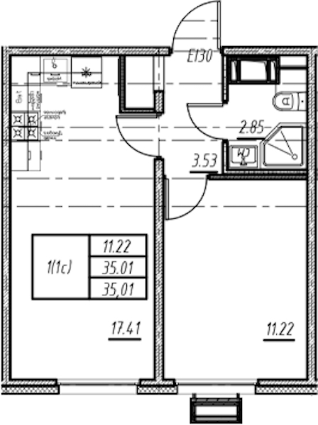 Однокомнатная квартира на 10-ом этаже 35,01 кв.м