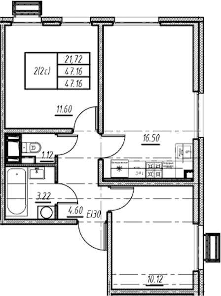Двухкомнатная квартира на 10-ом этаже 47,16 кв.м
