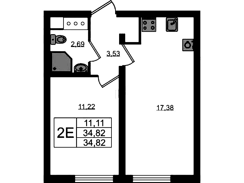 Однокомнатная квартира на 22-ом этаже 34,82 кв.м