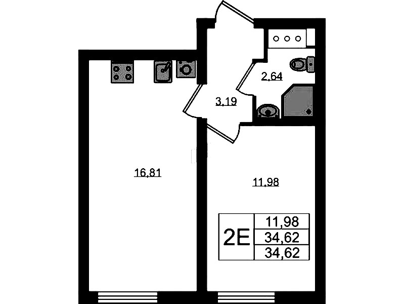 Однокомнатная квартира на 23-ем этаже 34,62 кв.м