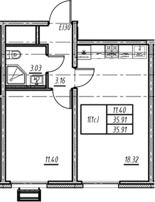 Однокомнатная квартира на 6-ом этаже 35,9 кв.м