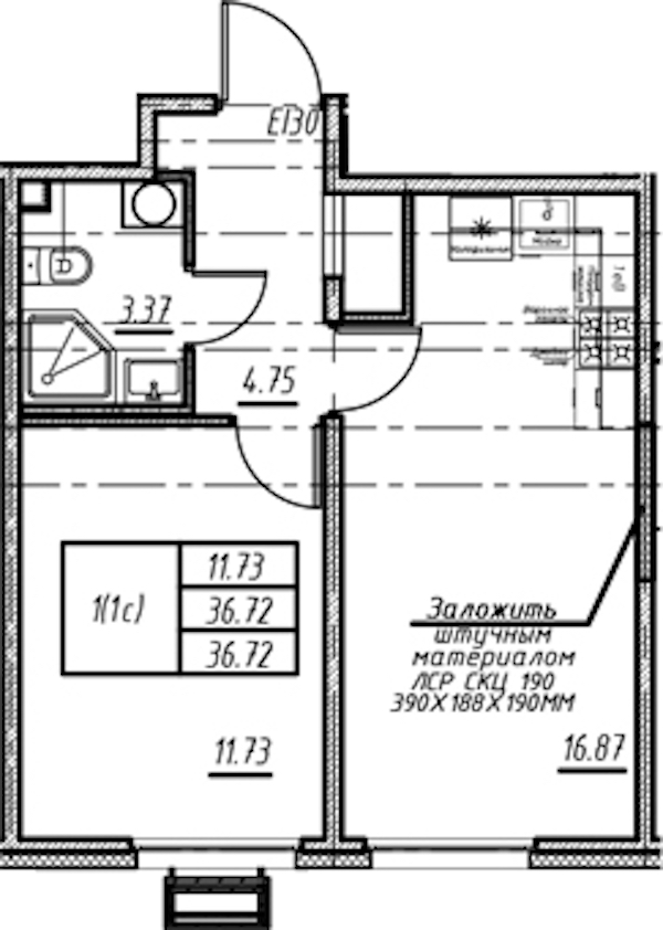 Однокомнатная квартира на 13-ом этаже 36,7 кв.м