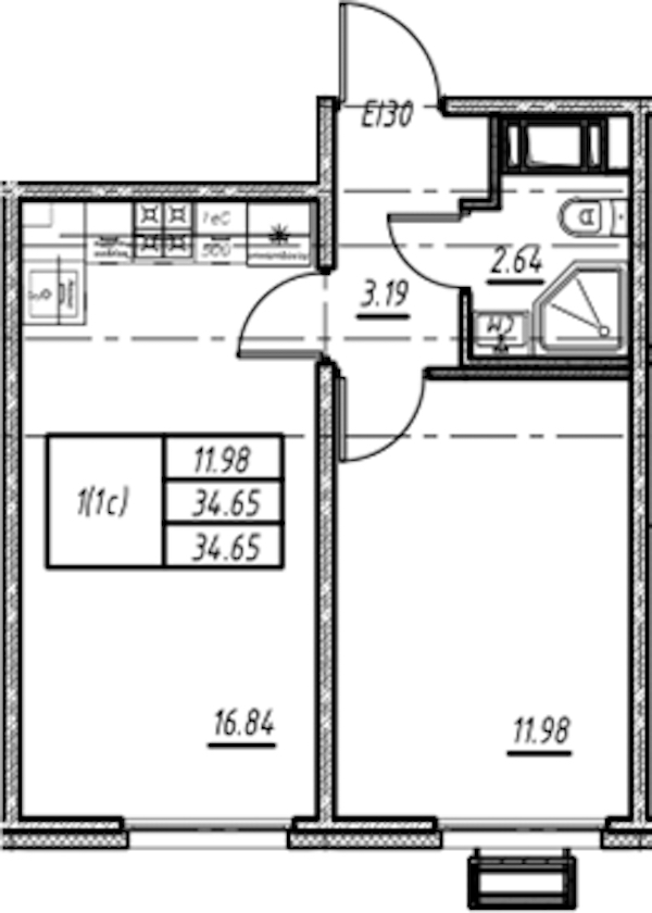 Однокомнатная квартира на 13-ом этаже 34,65 кв.м