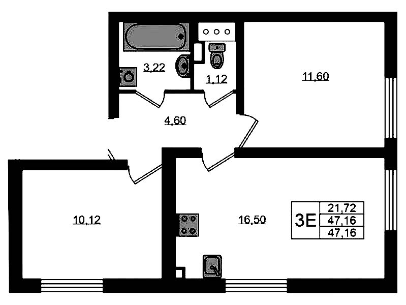 Двухкомнатная квартира на 13-ом этаже 47,16 кв.м