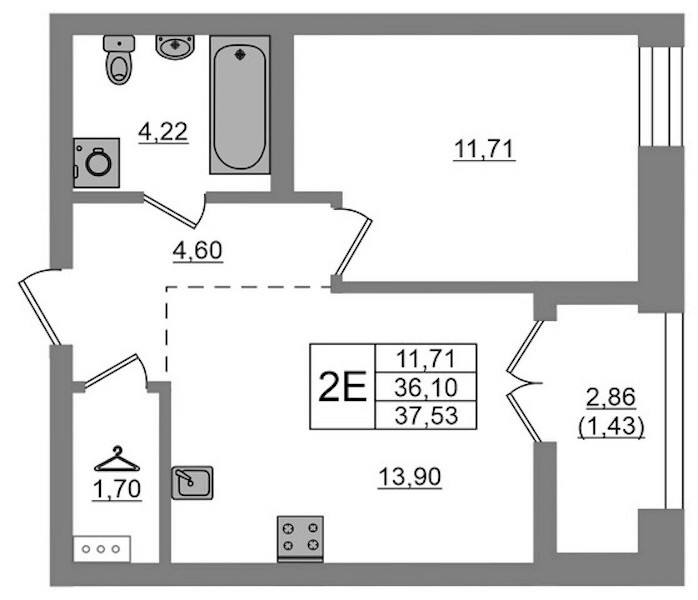 Однокомнатная квартира на 5-ом этаже 37,53 кв.м