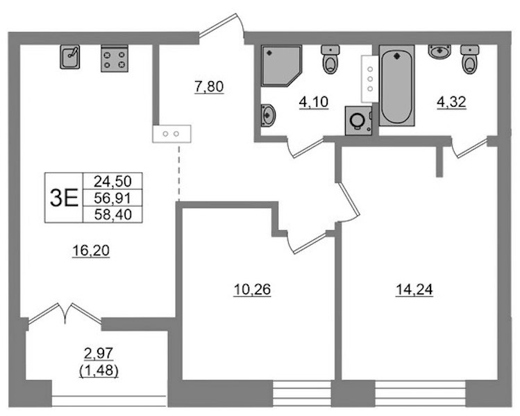 Двухкомнатная квартира на 5-ом этаже 58,4 кв.м