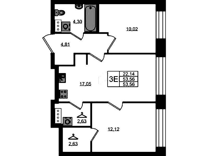 Двухкомнатная квартира на 3-ем этаже 53,56 кв.м