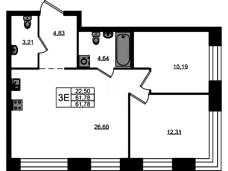 Двухкомнатная квартира на 2-ом этаже 61,78 кв.м