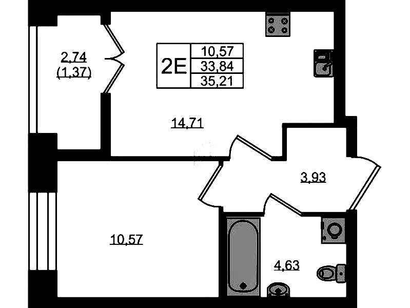 Однокомнатная квартира на 2-ом этаже 35,21 кв.м