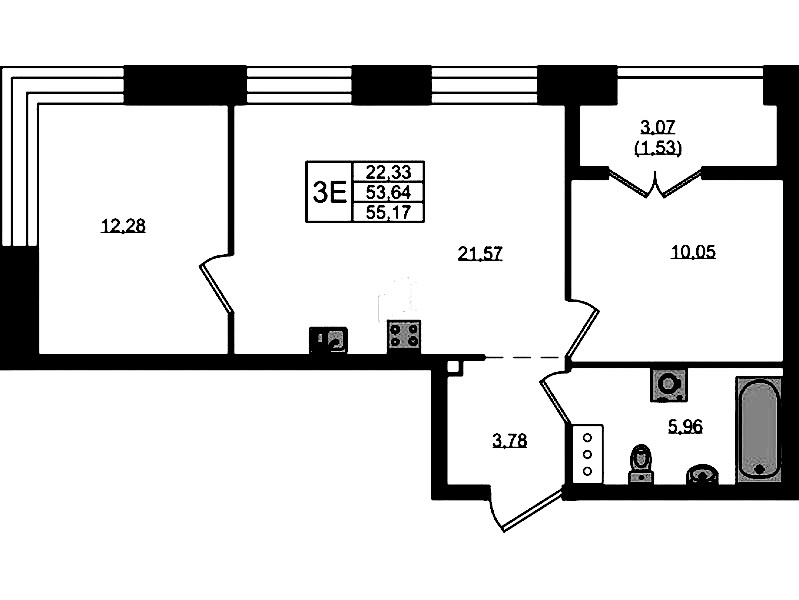 Двухкомнатная квартира на 6-ом этаже 55,17 кв.м