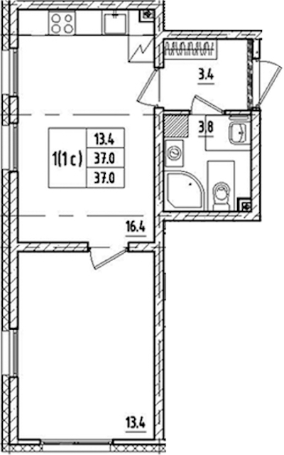 Однокомнатная квартира на 2-ом этаже 37 кв.м