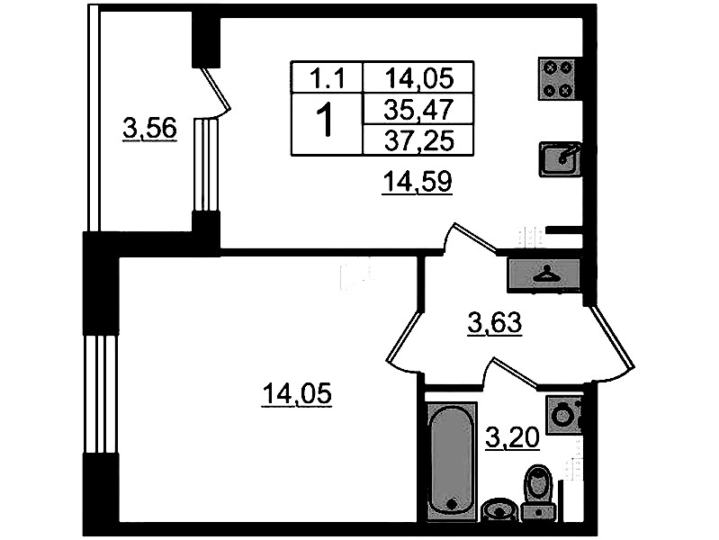 Однокомнатная квартира на 4-ом этаже 35,47 кв.м