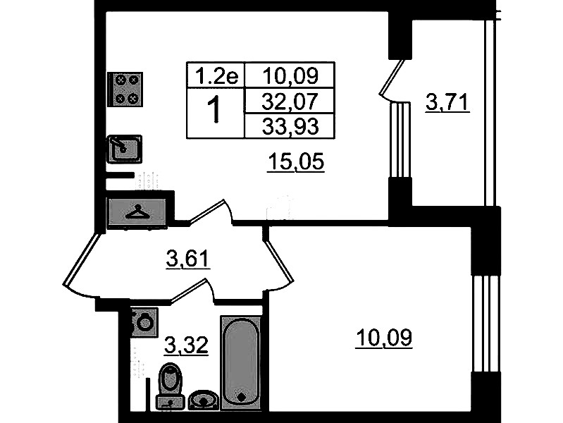 Однокомнатная квартира на 4-ом этаже 32,07 кв.м
