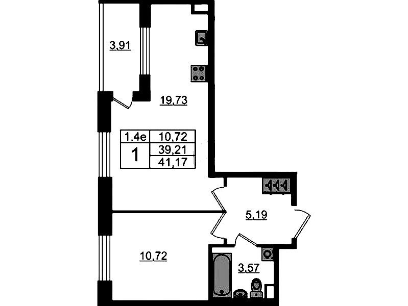 Однокомнатная квартира на 2-ом этаже 39,21 кв.м