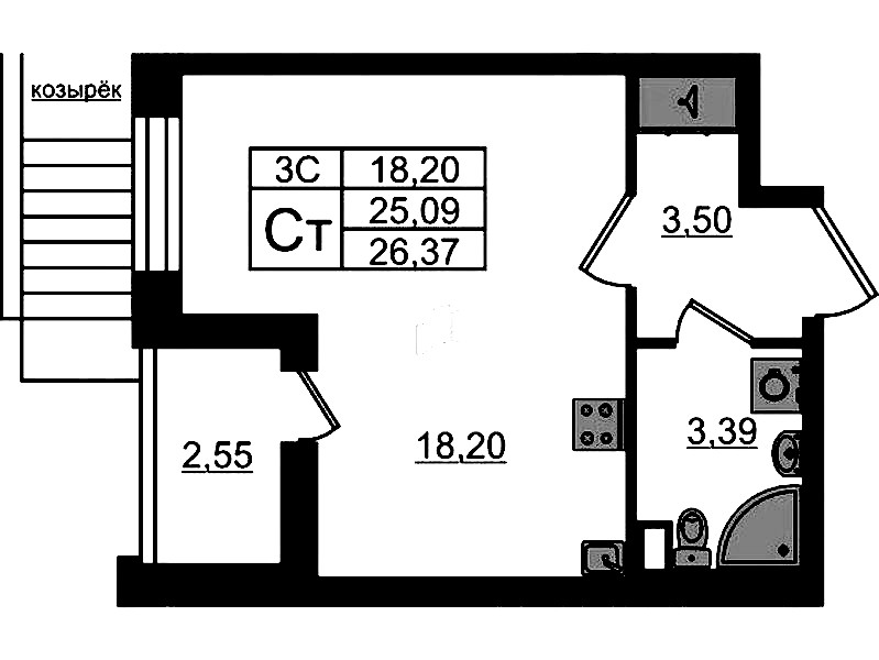Квартира-студия на 1-ом этаже 25,09 кв.м