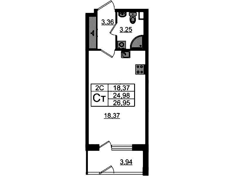 Квартира-студия на 1-ом этаже 24,98 кв.м