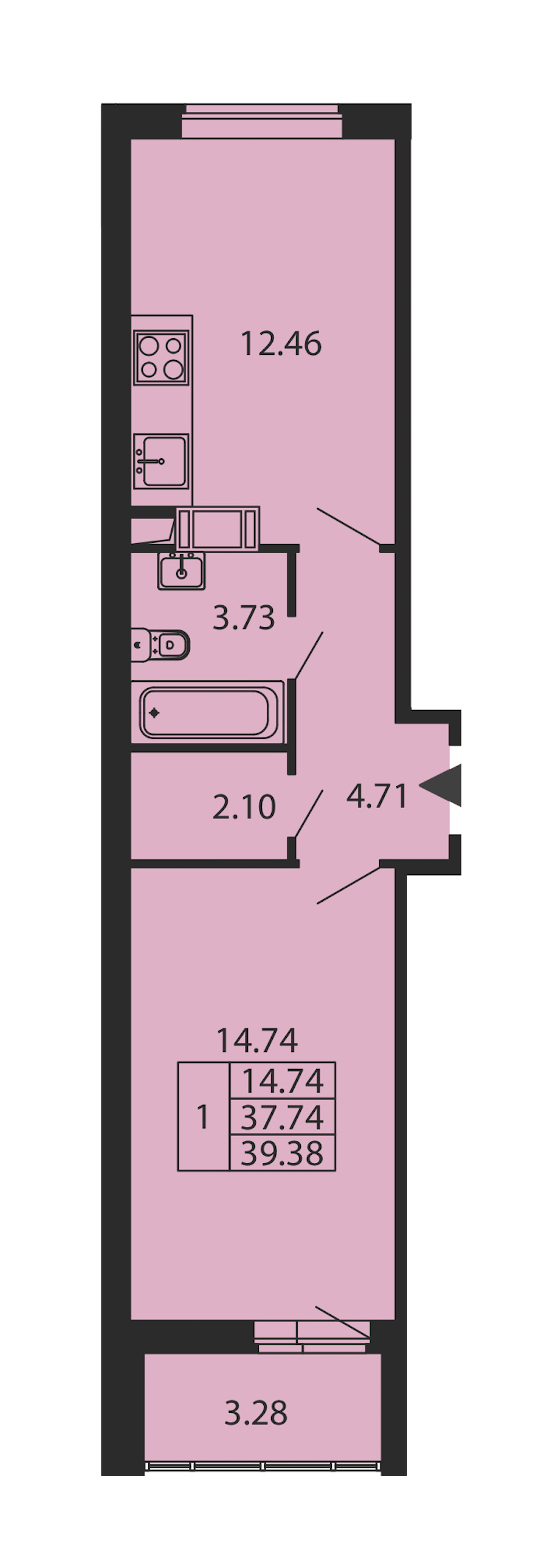 Однокомнатная квартира на 2-ом этаже 37,74 кв.м